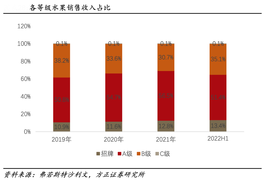 經典案例:根據弗若斯特沙利文、方正證券研究所等綜合資訊表明,百果園A、B 級水果占據主要份額,高端水果占比持續提升。A 級果銷售收入占比達 30% 以上,B 級果銷售收入占比達 50%以上,招牌水果占比穩步提升,由 19 年的 10.9% 提升到了 13.4%。截止 2023 年 H1 招牌果和 A 級果銷售收入之和占門店零售總額 67%,百果園的高端水果銷售占比持續提升。
