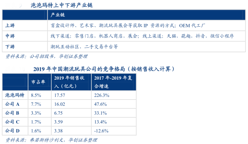 經典案例:泡泡瑪特是潮玩行業中打通潮玩全產業鏈的優秀企業,根據弗若斯特沙利文、華創證券等綜合資訊顯示,其從潮玩品牌IP打造和運營)、OEM生產、線上線下渠道銷售、潮玩社區搭建(葩趣 APP)及潮流玩具文化推廣(大型潮玩展會)進行了“潮玩全產業鏈”覆蓋。其核心競爭力來源于品牌IP資源,潮玩IP的獲取方式包括藝術家原創或者由電影、動漫、游戲或者其他內容授權而得。