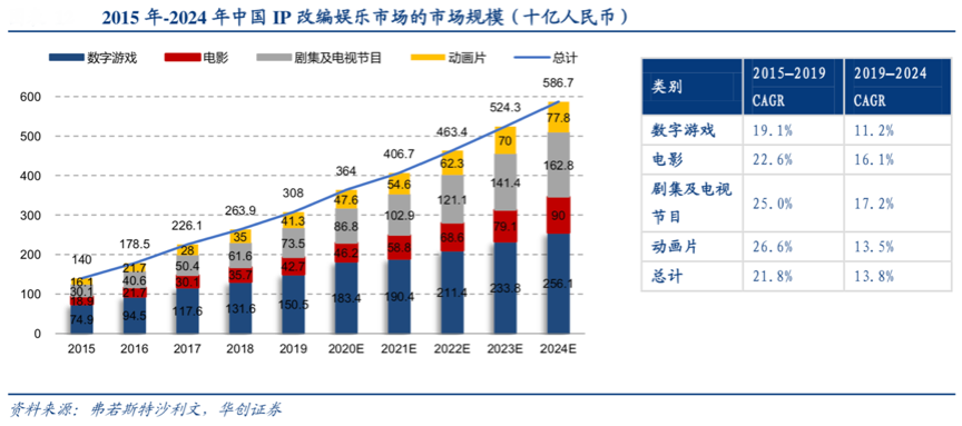 潮玩的商業化經營范圍廣泛,其本質在于品牌IP的商業化運作,品牌IP可以在數字游戲、電影、劇集、電視節目及動畫片等領域大規模應用,極富商業價值及商業意義。根據弗若斯特沙利文、華創證券等綜合資訊顯示,中國IP改編娛樂市場在 2015 年至 2019 年間年復合增長率為 21.8%,預計于 2019 年達 3,080 億元,于 2024 年 達到5,867 億元,2019 年至 2024 年年復合增長率為 13.8%,市場規模持續擴大。