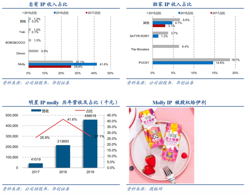 經典案例:根據公司招股書、華創證券、搜狐網等綜合資訊顯示,泡泡瑪特的商業模式以品牌IP業務為核心,覆蓋潮流玩具全產業鏈,包括藝術家發掘、IP 運營、消費者觸達以及潮流玩具文化推廣。截至招股書披露日,泡泡瑪特共運營 85 個 IP,包括 12 個自有 IP、22 個獨家 IP 及 51 個非獨家 IP。頭部 IP 營收較高,2019 年,已有 4 個 IP 單獨產生收入超過了 1 億元人民幣,分別是 Molly,Dimoo,PUCKY,The Monsters;同時Molly的IP形象甚至都被授權給伊利、香港美心月餅以推廣產品。