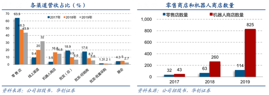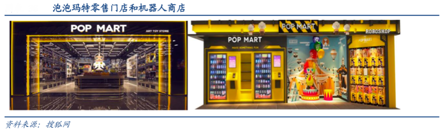 經典案例:根據公司招股說明書、華創證券、搜狐網等綜合資訊顯示,截至2019年底,泡泡瑪特在中國33個一二線城市的主流商圈擁有114家直營零售店、全國 57 個城市擁有 825 家機器人商店。2018年單個機器人商店收入為33 萬,2019年單個機器人商店收入為 30 萬。除此之外,公司每年舉辦北京和上海國際潮 玩展以擴大影響力和收集新創意。批發渠道方面,目前國內擁有 22 家經銷商,海外有 19 家經銷商。2019 年零售店收入占比為43.9%,線上渠道收入占比 32%,機器人商店收入占比為 14.8%。