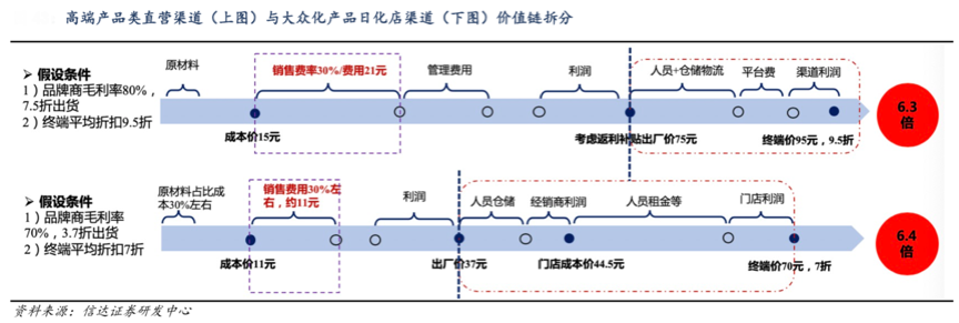 極高的“品類加價率”催生了美容化妝品行業的商業創新,用戶的“消費話語權”日益提升,渠道運營價值鏈逐漸得到強化。根據信達證券研發中心等綜合資訊表明,以類偏高端產品百貨渠道類直營模式為例,其流通環節包括品牌商-代理商(承擔物流職能為主)—百貨商城,一般而言,品牌商出貨折扣較高,超過 7 折,終端銷售折扣力度少,9折以上。我們假設品牌方毛利率 80%,出貨折扣為 7.5 折,終端銷售折扣為 9.5 折,則終端價/成本價為 6.3 倍。綜合看,化妝品擁有較高的加倍率。