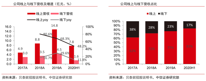 經典案例:根據貝泰妮招股說明書、中信證券研究部等綜合資訊表明,貝泰妮公司早期從線下渠道起家,依靠滇虹藥業的藥企背景和渠道資源,迅速與相關醫院建立合作關系,在臨床和 OTC 渠道 鋪開。2012 年其設立電商部門,緊抓電商風口,大力發展線上渠道。2017-2019 年其線下與線上渠道收入 CAGR 分別為 23.0%與74.3%。2020H1,其線上收入占比已高達 83.2%,毛利占比達 82.0%。
