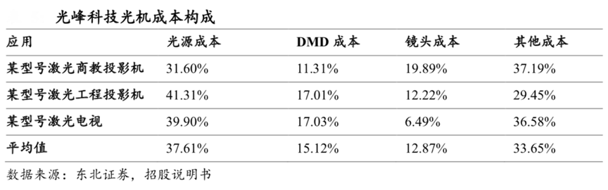 經典案例:根據東北證券、招股說明書等綜合資訊表明,光峰科技公司需要對外采購日本日亞生產的藍光激光器、TI 生產的 DMD 芯片和日本理光生產的超短焦鏡頭,并與公司自主制造的熒光模組組裝成為激光顯示整機所需的光機,并作為核心器件提供給產業應用,用于各類激光顯示應用領域。從光機產品來看,光源成本占比最高在30-40%之間,DMD 成本占比在15-20%,鏡頭成本占比約12%左右。