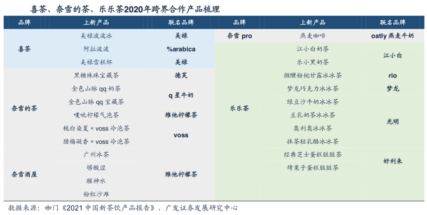經(jīng)典案例:根據(jù)咖門《2021中國新茶飲產(chǎn)品報告》、廣發(fā)證券發(fā)展研究中心等綜合資訊表明,現(xiàn)制茶飲品牌的新品形態(tài)包括產(chǎn)品升級、與甜品/咖啡/酒跨界融合、節(jié)日限定、加料/奶蓋等微創(chuàng)新、品牌聯(lián)名等,其也會在宣傳中著重強調(diào)產(chǎn)品/用料的產(chǎn)地、制作工藝,并配套以獨具特色的設(shè)計風格的專屬杯型、杯套、紙袋等周邊元素以提升消費者的價值認同。