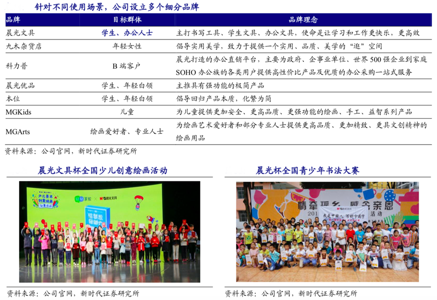 經典案例:根據公司官網、新時代證券研究所等綜合資訊表明,晨光公司針對不同使用場景設立多個細分品牌,包括晨光文具、九木雜貨店、科力普、晨光優品、本位、MGKids 和 MGArts 七大品牌。并自2013年起已舉辦六屆“晨光文具杯”少兒美術創意繪畫征集活動,獲得教育界、社會媒體及眾多藝術愛好者的廣泛關注。