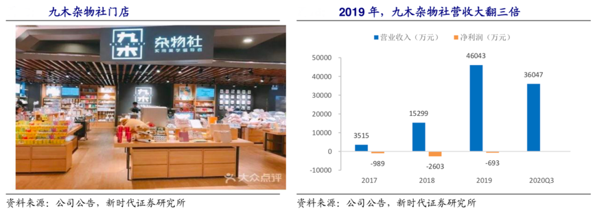 經典案例:根據公司公告、新時代證券研究所等綜合資訊表明,九木雜物社以年輕女性及家庭作為目標消費群體,產品主要為文具、文創、益智文娛、實用家居等品類,店鋪分布在各城市核心商圈的購物中心,是一家文創雜貨集合店,是晨光公司基于文創生活的新零售模式探索。截至 2020Q3,晨光公司已開設九木雜物社 334 家(直營 211 家、加盟 123 家)。