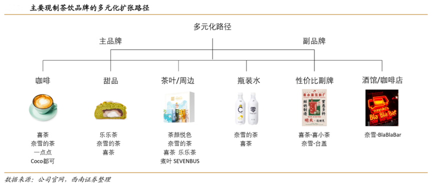 經典案例:根據公司官網、西南證券等綜合資訊表明,深耕一線城市的高端網紅品牌對客流、客單量的要求更高,奈雪、喜茶的推新速度在 1-1.2 款/周,除了茶飲相關產品,兩者還在瓶裝水、餐飲副 牌的領域試水經營。而小店經營的模式并不適合提供多樣化的 SKU,茶顏悅色、蜜雪冰城一年上新款式不到 5 個。