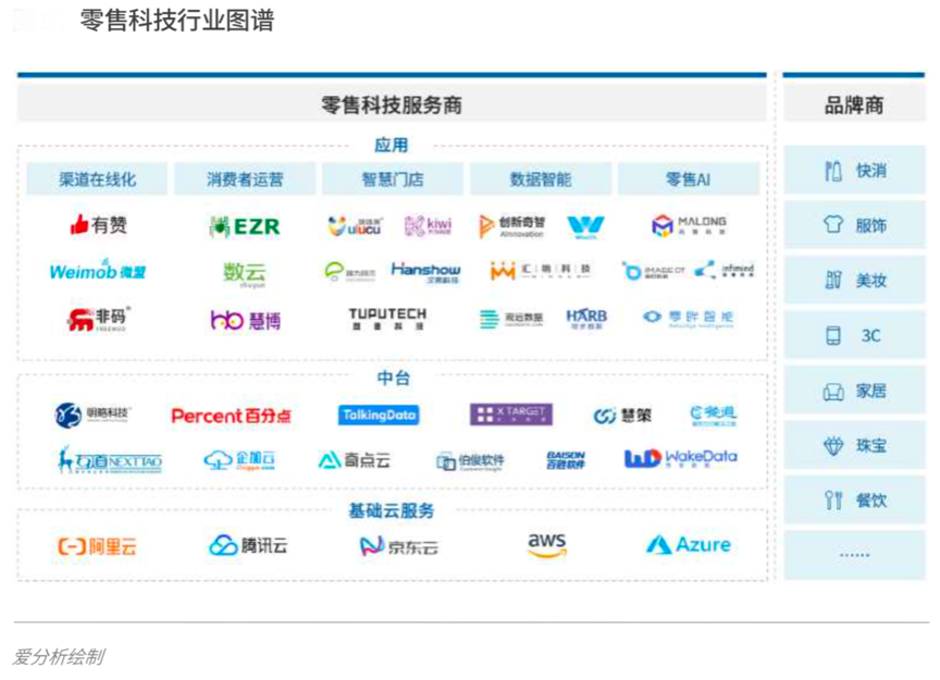 據(jù)愛分析等綜合資訊顯示,零售科技行業(yè)服務(wù)商其目前應(yīng)用大多集中在營銷前端,尤其集中在消費者運營、智慧門店及數(shù)據(jù)智能化等方面,智能零售的技術(shù)已經(jīng)比較完善。