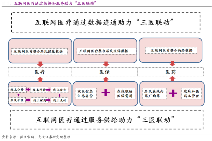 互聯(lián)網(wǎng)醫(yī)療涉及到醫(yī)療、醫(yī)保、醫(yī)藥等多個醫(yī)療環(huán)節(jié),需要以數(shù)字化技術(shù)作為重要系統(tǒng)支撐,互聯(lián)網(wǎng)醫(yī)療通過數(shù)據(jù)和服務(wù)助力“三醫(yī)聯(lián)動”,醫(yī)療數(shù)據(jù)和醫(yī)療服務(wù)成為互聯(lián)網(wǎng)醫(yī)療發(fā)展的兩大核心環(huán)節(jié)。據(jù)微醫(yī)官網(wǎng)、光大證券研究所等綜合資訊表明,互聯(lián)網(wǎng)醫(yī)療的快速發(fā)展,需要借助醫(yī)療服務(wù)強化醫(yī)生患者在線溝通、在線診斷建議及線上處方開具等,以服務(wù)聚合醫(yī)療消費;同時大量醫(yī)療服務(wù)需要強化醫(yī)保支付、信息匯總,更需要強化醫(yī)藥數(shù)據(jù)同步、藥品管理等,強大且專業(yè)的醫(yī)療數(shù)據(jù)使醫(yī)療服務(wù)更具成效、更具價值。