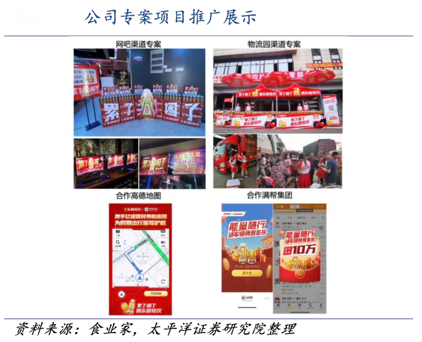 經典案例:根據食業家、太平洋證券研究院等綜合資訊表明,東鵬飲料公司除 了在市場端推廣以外,針對開車人群線下同步布局渠道專案項目,深入加油站、高速服務區、物流園、專業市場、駕校 等場景,從 2018 年開始至今公司已經打造 3+萬個物流應用場所,平均單點銷量提升300%。公司針對電競人群實施網吧渠道專案,通過終端形象建設、開卡消費等活動拉動消費,3年覆蓋近 3 萬家網吧,平均單點銷量提升200%。