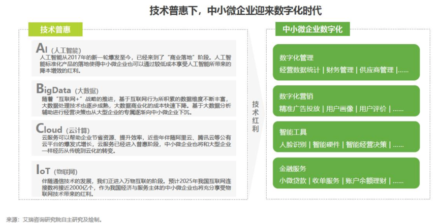 “技術(shù)賦能”對(duì)于傳統(tǒng)企業(yè)數(shù)字化是極為重要的,傳統(tǒng)企業(yè)的業(yè)務(wù)進(jìn)化及商業(yè)模式革新需要強(qiáng)大的“數(shù)字化技術(shù)”革新推進(jìn)。隨著以人工智能、大數(shù)據(jù)、云計(jì)算、物聯(lián)網(wǎng)為代表的前沿?cái)?shù)字技術(shù)快速發(fā)展,大量的技術(shù)服務(wù)及技術(shù)能力已經(jīng)標(biāo)準(zhǔn)化,在數(shù)字化管理、數(shù)字化營(yíng)銷、智能金融服務(wù)等方面幫助中小微企業(yè)實(shí)現(xiàn)數(shù)字化升級(jí)。