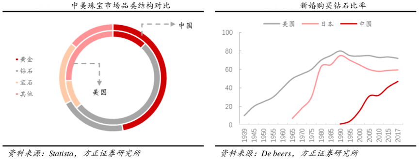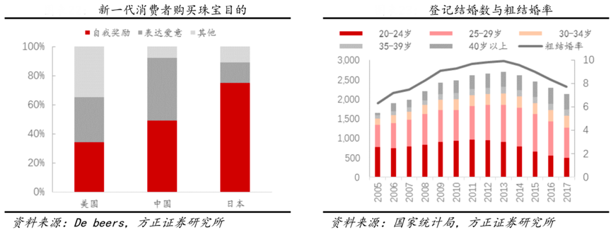 經典案例:根據De beers、國家統計局、方正證券研究所等綜合資訊表明,我國新一代購買鉆石時自我獎勵的因素高達 49%,高于成熟的珠寶市場美國 34%的比例,但低于日本 75%的超高水平。珠寶產品的多元化應用場景,無疑將大大提升其人均消費量及購買機率。