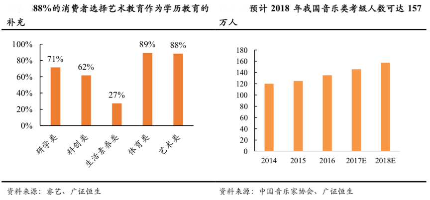 經典案例:根據睿藝、中國音樂家協會、廣證恒生等綜合資訊表明,88%的家長選擇藝術教育作為學歷教育的補充。根據中國音樂家協會統計,早在2016年我國參與音樂類社會考級的學員就有 135 萬人,音樂需求的持續擴大,必會大大推動品類領導者的市場占有率及人均消費量。