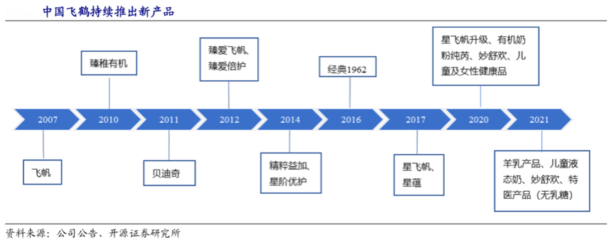 經(jīng)典案例:根據(jù)公司公告、開源證券研究所等綜合資訊表明,飛鶴持續(xù)進(jìn)行產(chǎn)品升級(jí),如 2015 年上線互聯(lián)網(wǎng)專供嬰幼兒奶粉品牌“舒貝諾”、2017 年推出星蘊(yùn)孕產(chǎn)婦奶粉,產(chǎn)品持續(xù)升級(jí)態(tài)勢明顯。