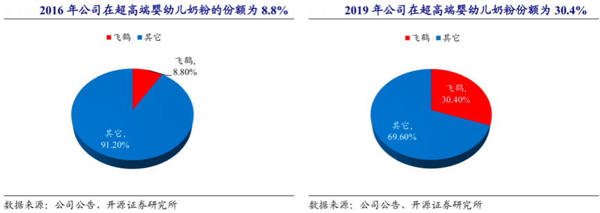 經(jīng)典案例:根據(jù)公司公告、開源證券研究所等綜合資訊表明,飛鶴不斷推出高端、超高端新品,2016年公司在國內(nèi)超高端嬰幼兒配方奶粉行業(yè)上僅有 8.8%的 市場份額,2019 年增至30.4%,目前已經(jīng)成為全國超高端嬰幼兒奶粉第一品牌。