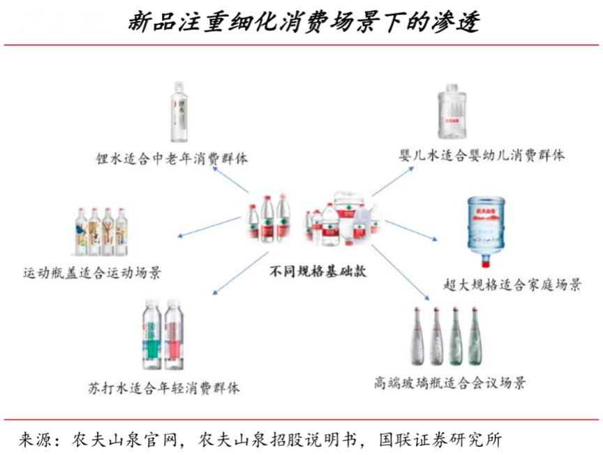 經典案例:根據農夫山泉官網、農夫山泉招股說明書、國聯證券研究所等綜合資訊表明,農夫山泉推出了針對不同消費場景下的飲用水細分產品,如針對高端消費者的天然礦泉水和玻璃瓶裝的充氣礦泉水,針對嬰幼兒的飲用水,能單手打開的運動瓶蓋礦泉水以及適合中老年人的鋰水等。切入家庭、 辦公、會議、運動等細分領域幫助農夫山泉擺脫瓶頸期,提升產品滲透力。