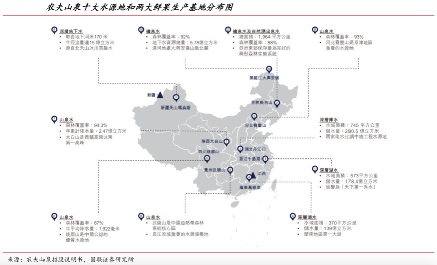經典案例:根據農夫山泉招股說明書、國聯證券研究所等綜合資訊表明,農夫山泉當前擁有10大主要水源地,均勻分布在全國各大城市群附近,能有效覆蓋主要城市群的需求。