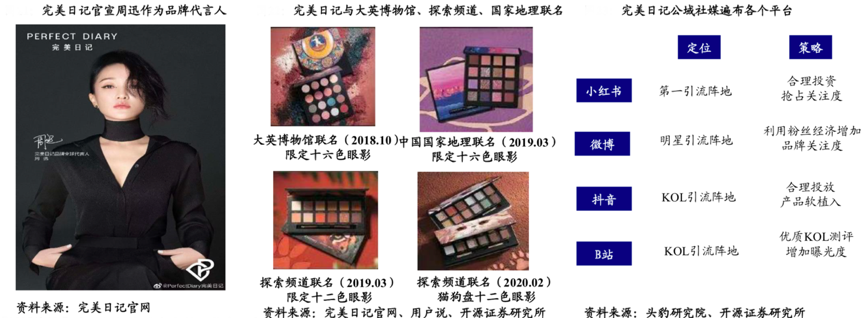 經(jīng)典案例:根據(jù)完美日記網(wǎng)官網(wǎng)、用戶說、頭豹研究院及開源證券研究所等綜合資訊表明,完美日記的用戶經(jīng)營(yíng)極具看點(diǎn),其于2020年10月官宣周迅作為品牌全球代言人,聯(lián)合李佳琦進(jìn)行傳播,并先后與大英博物館、Discovery探索頻道、中國(guó)國(guó)家地理、紐約大都會(huì)藝術(shù)博物館聯(lián)名,社媒渠道遍布小紅書、微博、抖音、B站等各個(gè)平臺(tái),截至2020年11月,完美日記的小紅書品牌賬號(hào)已擁有194.9萬(wàn)粉絲,遠(yuǎn)超其他知名國(guó)貨、外資彩妝品牌。