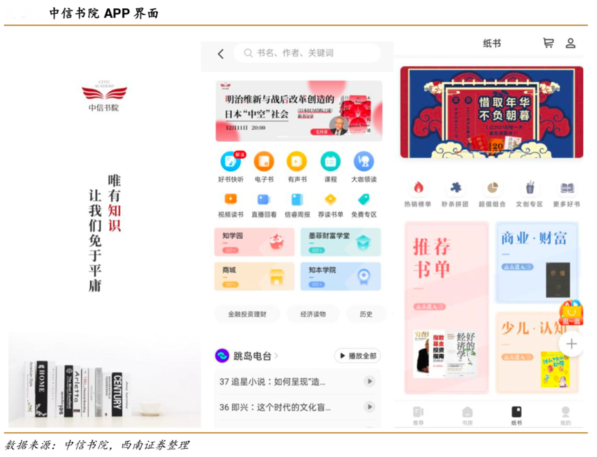 經(jīng)典案例:根據(jù)中信書院、西南證券等綜合資訊表明,2020 年上半年,在加速推動(dòng)數(shù)字化升級(jí)的過程中,中信書院用戶增長(zhǎng)近 100 萬(wàn)人,中信書院拓展了中信出版提供知識(shí)的形態(tài)與方式,針對(duì)不同場(chǎng)景與人群,提供個(gè)性化的知識(shí)服務(wù),包括文字、音頻和視頻,內(nèi)容上也依托中信出版自身的版權(quán)資源提供不同領(lǐng)域的服務(wù),分領(lǐng)域?qū)κ鼙娺M(jìn)行書籍推薦。