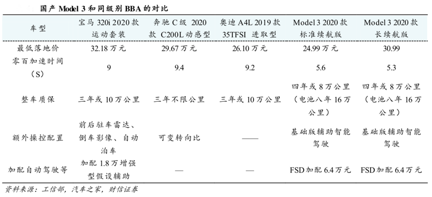 經典案例:根據工信部、汽車之家和財信證券等綜合資訊表明,2020 年 11 月份國內特斯拉 Model 3 銷量 2.16 萬輛,排名為國內新能源車銷量榜單第二 。目前和特斯拉處于同一價格區間的 BBA 單款轎車每月銷量大多在 1.5 萬輛,特斯拉率先改變了國內豪華車的格局,形成“BBAT”四強局面。隨著 10 月 1 日的降價以及隨后出臺的上海外牌政策,Model 3 的 11 月份月銷量從 1-10 月份的 1.2 萬輛水平爬坡至 2 萬輛的水平。