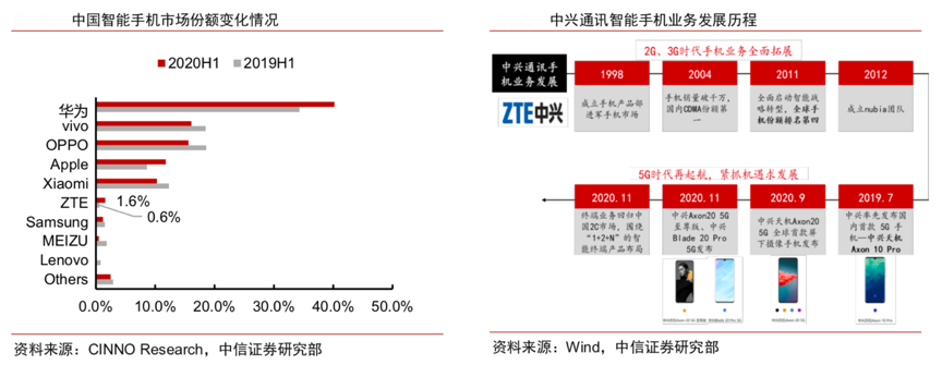 經(jīng)典案例:根據(jù)CINNO Research、wind、中信證券研究部等綜合資訊表明,2020H1,中興通訊在中國(guó)智能手機(jī)市場(chǎng)的市占率提升至 1.6%(2019H1 為 0.6%),11 月,中興通訊在終端渠 道合作伙伴大會(huì)上表示:2021 年,中興通訊終端業(yè)務(wù)將全面回歸中國(guó) 2C 市場(chǎng),打造“1+2+N” 的智能終端產(chǎn)品布局:以手機(jī)核心產(chǎn)品為入口,圍繞個(gè)人數(shù)據(jù)和家庭數(shù)據(jù) 2 大方向,配合智能穿戴等生活周邊產(chǎn)品,致力于打造科技、品質(zhì)、年輕的終端品牌形象。