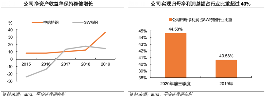 經典案例:根據wind、平安證券研究所等綜合資訊表明,中信特鋼盈利能力強大,2015年以來盈利能力一直保持穩健增長。2019 年公司資產重組實現整體上市后,公司盈利絕對額占 SW 特鋼 14 家上市公司盈利總額比重超過40%,盈利規模位居行業之首。