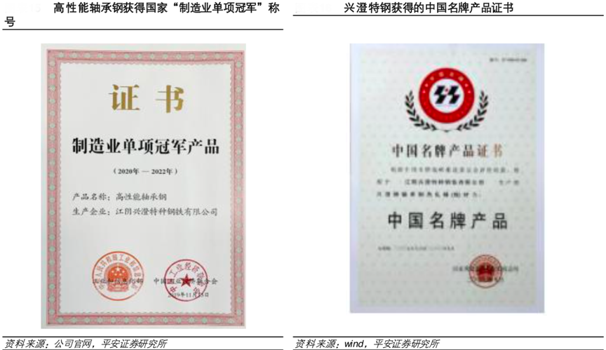 經典案例:根據公司官網、wind、平安證券研究所等綜合資訊表明,中信特鋼是中國鋼鐵工業協會副會長單位和中國特鋼企業協會會長單位,在中國特鋼行業居主導地位,發揮著“風向標”作用;2019年,子公司興澄特鋼高性能軸承鋼獲得工信部發布 “制造業單項冠軍”稱號;青島特鋼 1960MPa 級 橋 梁纜索盤條榮獲中國鋼協頒發的“中國鋼鐵工業產品開發市場開拓獎”。