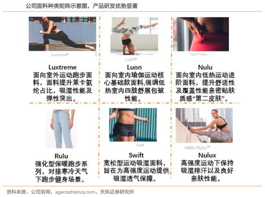 經典案例:根據公司官網、agentathletica.com、天風證券研究所等綜合資訊表明,Lululemon 于 1998 年創立初始即針對瑜伽新興運動重新規劃設計面料,利用尼龍材料本身的拉伸韌性優勢為面料基礎,配合萊卡氨綸材料彈性柔軟特性,分別以 86%-14%配比推出現代瑜伽服專用面料 Luon。Luon 面料強度韌性及對身體皮膚覆蓋性能更優秀,同時具備純萊卡氨綸面料所不具備的透氣吸濕功能。