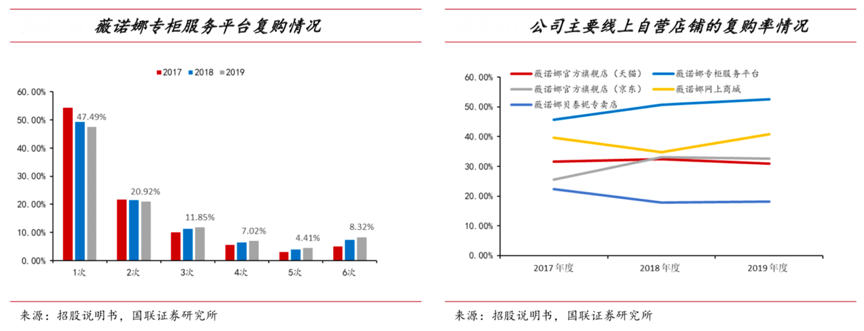 經(jīng)典案例:根據(jù)招股說明書、國聯(lián)證券研究所等綜合資訊表明,薇諾娜專柜服務平臺客戶的購買頻次在 2 次及以上的客戶數(shù)量占比較高,2017- 2019 年逐年提升,分別為 45.61%、50.70%、52.51%。其客單價較高,主要集中于 1,001-20,000 元區(qū)間內(nèi),而其線上自營店鋪用戶在快速增長的同時,復購率保持 30%左右。