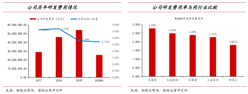 經(jīng)典案例:根據(jù)招股說明書、國聯(lián)證券研究所等綜合資訊表明,截至 2020 年上半年,貝泰妮擁有境內(nèi)有效專利46 項, 并掌握 11 項核心技術,在利用馬齒莧、青刺果、滇山茶等高原特色植物進行植物提取物的有效成分制備,以及生產(chǎn)含有高原特色植物活性成分的敏感肌膚護理產(chǎn)品方面具有較強的技術優(yōu)勢。2017-2019 年其研發(fā)費用的年復合增速為 37%,2019 年研發(fā)費用率為 2.78%, 高于同行業(yè)其他可比上市公司。