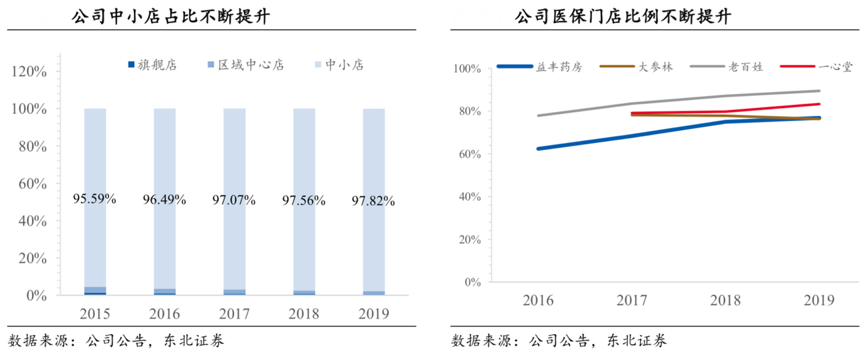 經(jīng)典案例:根據(jù)公司公告、東北證券等綜合資訊表明,隨著益豐藥房在各區(qū)域市場的深耕,深入社區(qū)的中小店的比例逐年提高。其對醫(yī)保門店的比例也愈發(fā)重視,2016年醫(yī)保比例僅 62.3%,提升至 2019 的 76.82%,與行業(yè)水平的差距逐年縮小。尤其在華東地區(qū) 2016-2019 年醫(yī)保覆蓋率從 36.91%增長至 72.52%,使得其競爭力繼續(xù)增強(qiáng)。