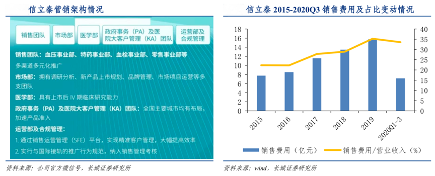 經(jīng)典案例:根據(jù)公司官方微信號、wind、長城證券研究所等綜合資訊表明,信立泰公司是行業(yè)內(nèi)帶量采購之后少數(shù)幾家持續(xù)加碼營銷企業(yè)之一,2020 年前三季度銷售費用 7.16 億元,占同期營業(yè)收入的比重約為 33.53%。其已經(jīng)組建覆蓋全國的循證醫(yī)學推廣團隊,其目前推廣體系由銷售團隊、市場部、醫(yī)學部、政府事務(wù)(PA)及醫(yī)院大客戶管理(KA) 團隊、運營部及合規(guī)管理五部分構(gòu)成。