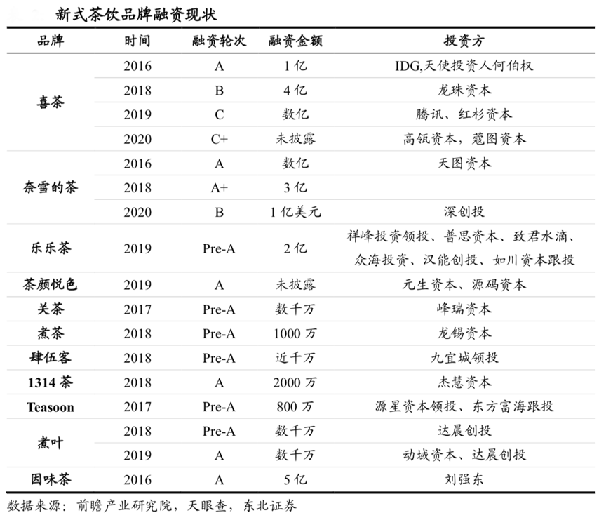 經典案例:資本驅動企業再增長。根據前瞻產業研究院、天眼查、東北證券等綜合資訊表明,新式茶飲行業已經成為了備受青睞的投資風口,眾多知名品牌已經完成了 A 輪和 Pre-A 輪融資。創立時間最早的喜茶目前已經完成了第四輪的 C+輪融資,同時主打“新茶飲+軟歐包”的奈雪的茶也在2020年獲得了由深創投領投的 B 輪融資 1 億美元。
