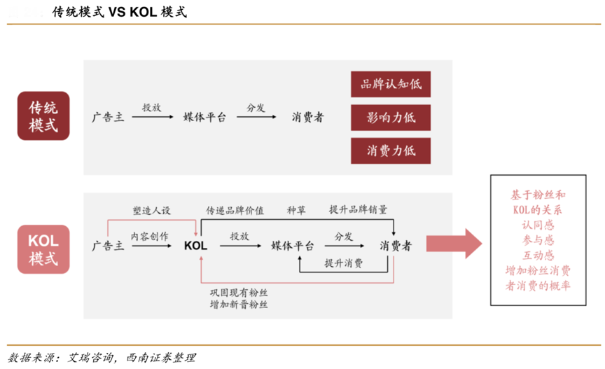 經(jīng)典案例:根據(jù)艾瑞咨詢、西南證券等綜合資訊表明,KOL 模式下,廣告主 通過 KOL 投放廣告,精準(zhǔn)鏈接品牌與消費(fèi)者,有效利用 KOL 自身的號(hào)召力、影響力和粉絲生態(tài)圈,基于粉絲和 KOL 之間的認(rèn)同感、參與感、互動(dòng)感來增加粉絲消費(fèi)者消費(fèi)的概率,同時(shí)也加強(qiáng)了品牌在粉絲群體中的知名度和影響力。