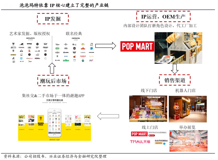 經典案例:根據公司招股書、興業證券經濟與金融研究院等綜合資訊表明,泡泡瑪特是國內覆蓋潮流玩具全產業鏈的一體化平臺型公司,包括藝術家發掘、IP 運營、OEM生產、消費者觸達及潮流玩具文化的推廣這四個環節,最后一環潮玩后市場的培育又進一步助力前端發掘潛質 IP。