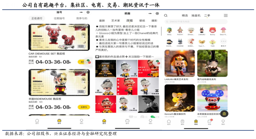 經典案例:根據公司招股書、興業證券經濟與金融研究院等綜合資訊表明,泡泡瑪特葩趣平臺作為自有線上玩具社交平臺,從購買到增值服務全平臺覆蓋,二手交易、改娃、曬娃進一步完善了二手交易及潮玩社交性。