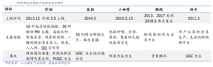 經(jīng)典案例:根據(jù)《獨角獸之路》、艾瑞咨詢、國盛證券研究所等綜合資訊表明,2011 年,GIF 快手的用戶以動圖愛好者為主,他們將 GIF 快手作為工具產(chǎn)品,創(chuàng)作后在微博等外部社區(qū)進行傳播,而 GIF 快手也積累了第一批用戶。之后快手通過版本迭代,強化內(nèi)容屬性,從工具產(chǎn)品向短視頻 社區(qū)轉(zhuǎn)型。