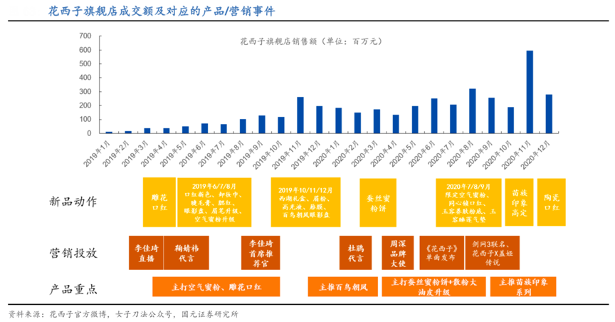 經(jīng)典案例:從花西子官方微博、女子刀法公眾號(hào)、國(guó)元證券研究所等綜合資訊表明,2019年為花西子爆發(fā)式成長(zhǎng)的關(guān)鍵節(jié)點(diǎn),一方面品牌確立空氣散粉與雕花 口紅兩個(gè)主推產(chǎn)品,另一方面與超頭主播李佳琦形成深度綁定。