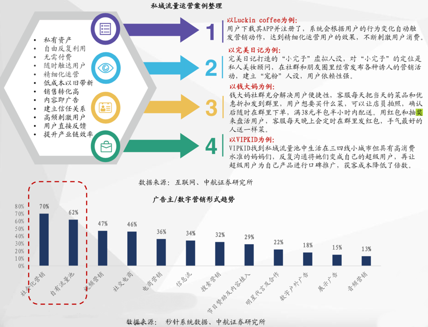 經典案例:根據秒針系統數據、中航證券研究所等綜合資訊表明,私域流量倍受關注,其通過強有力的私有資產、銷售轉化等點亮“品牌私域流量”,提升品牌影響力。其中,Luckin coffeexk系統根據用戶的行為變化自動觸發營銷動作,精細化運營用戶,完美日記以打造“小完子”等虛擬人設為主,錢大媽則以紅包和抽獎來盤活用戶。