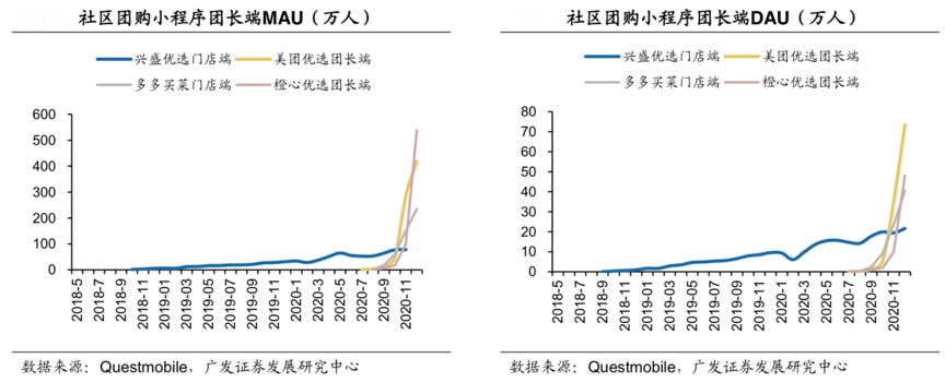 經典案例:根據Questmobile、廣發證券發展研究中心等綜合資訊表明,2020年12月,團長端小程序月活數量最多的平臺是橙心優選達到537.67萬,環比增速為444.97%,美團優選緊隨其后團長端小程序月活數為419.10萬,月環比增速為47.41%;多多買菜團長端月活數排名第三,234.50萬,MOM+ 56.24%。
