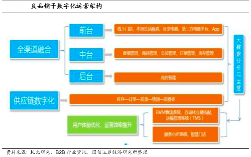 經典案例:根據托比研究、B2B行業資訊、國信證券經濟研究所等綜合資訊表明,2018年雙11前,良品鋪子打通線上到線下的通路,把2000多家智慧門店變成前置倉,用戶在線購買,自主選擇門店、外賣和快遞三種配送方式,線上線下全渠道消費依賴于數字化運營架構的“強力支撐”。