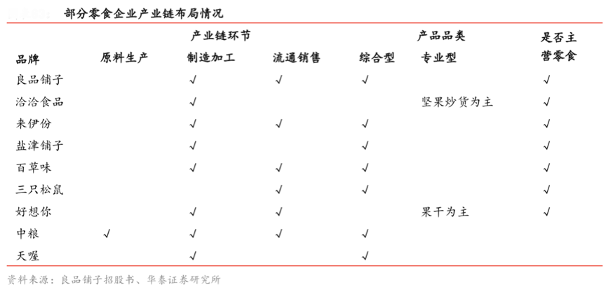 休閑食品的消費場景多元化明顯,食品消費更趨多樣化,前端的休閑食品“聚合式消費”牽引著休閑食品的生產制造及供應鏈進化,大量的休閑食品企業正在跨產業經營,從單一的產業環節向“多產業環節共進”發展,食品產業融合在即。如根據良品鋪子招股書、華泰證券研究所等綜合資訊表明,雨潤、獠子島為典型代表的上游環節原料生產企業向下游滲透,進入了零食加工領域;良品鋪子、百草味等下游 專業零售企業在經營品牌、研發產品的過程中向上游滲透,建設了自有加工工廠;更有大量食品、飲料以及餐飲企業同時生產或銷售零食產品,逐步進軍全產業鏈經營模式。