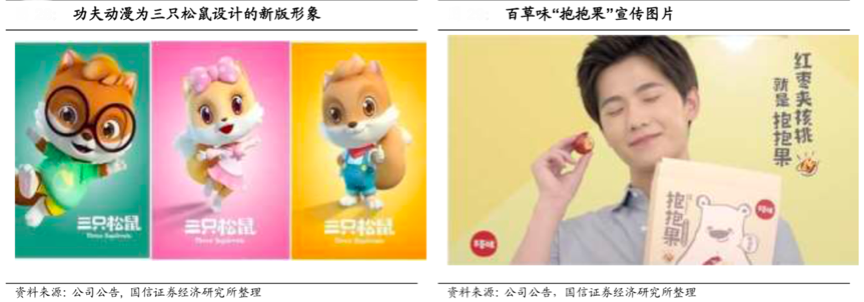 據公司公告、國信證券經濟研究所等綜合資訊表明,三只松鼠打造“三只 松鼠”超級大IP,開發制造內容和周邊產品,比如與功夫動漫聯合制作《三只松 鼠》動畫來助力超級 IP,從品牌變成一個活生生的、有溫度、能夠跟消費者進 行對話的形象。百草味更把自己定位為“趣味零食探索家”,比如把紅棗包 裹著核桃進行趣味解讀,取名為“抱抱果”,更新品牌IP。