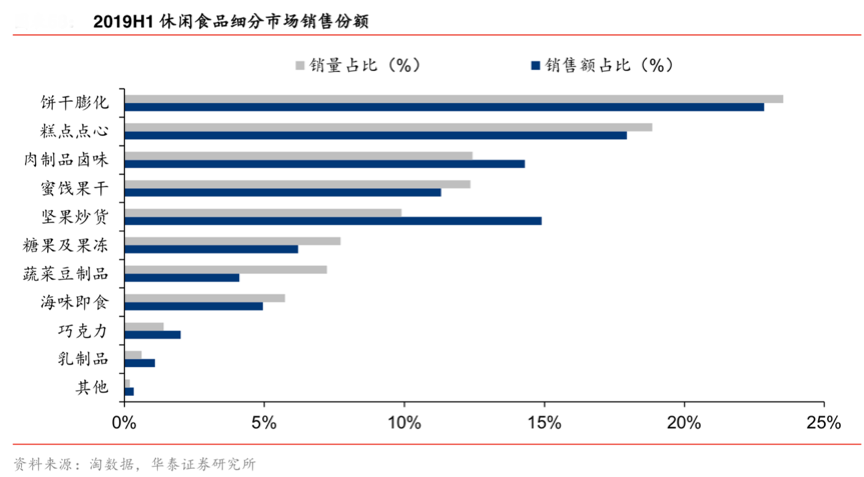 休閑食品品類覆蓋廣泛,有自己的專屬休閑特性,更有自己特色食品的價值。明星產品帶路,多品類組建,組合品類出擊,成為休閑食品迅猛崛起的“競爭利器”。根據淘數據、華泰證券研究所等綜合資訊表明,休閑食品的細分現象突出,餅干膨化、糕點點心、肉制品鹵味等品類占據主體地位,糖果炒貨、糖果果凍等隨之跟進,強化主題特色及多品類出擊成為休閑食品新零售品牌的“必修課”。