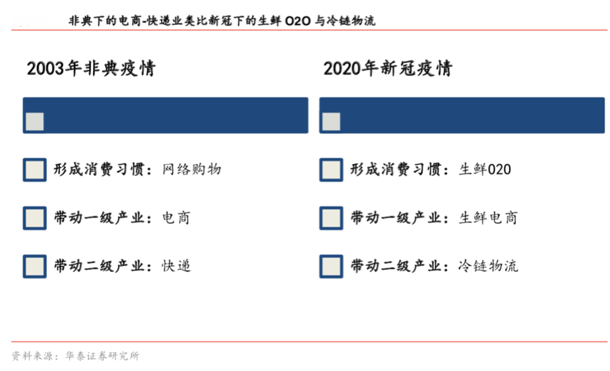 此次新冠疫情有助于培養消費者“線上下單—快速配送到家”的消費習慣,生鮮消費的線上線線下一體化廣受關注,強化線上商品展示、交流互動、下單分享、訂單分配等營銷策劃,根據華泰證券研究所等綜合資訊表明,生鮮O2O與冷鏈物流變化較大,優秀生鮮企業需要亮化配送到家、無接觸配送、社群服務、智能數據積累等,線上線下一體化業務推進更受關注,也極有發展潛力。