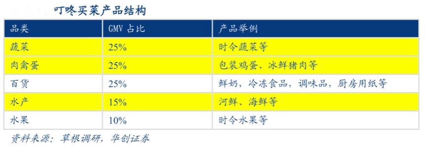 經(jīng)典案例:據(jù)草根調(diào)研、華創(chuàng)證券等綜合資訊顯示,從產(chǎn)品結(jié)構(gòu)看,叮咚買菜的品類構(gòu)成更接近菜市場業(yè)態(tài)。叮咚買菜著眼蔬菜、肉禽蛋等日常做飯所需食材,并極其 強(qiáng)調(diào)新鮮,以水產(chǎn)為突破,通過活蝦、活魚等差異化產(chǎn)品迅速打開市場提升口碑;其他眾多平臺仍以冷凍肉為主,而叮咚買菜主推冰鮮豬肉。每日優(yōu)鮮以水果為主要品類,水果品類 GMV 占比 40%,食品百貨 GMV 占比 40%。