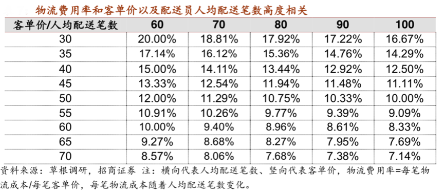 經典案例:據草根調研、招商證券等各方面資訊顯示,生鮮領域在配送端進入門檻比較低,叮咚買菜可以實現人均80-100單/天的配送,單筆配送費可以降低到5.5元/單。隨著叮咚買菜由于疫情客單價提高,履單費用將進一步縮小,未來盈利空間加強;疫情結束后,預計隨著訂單數的增加,履約費用進一步降低。