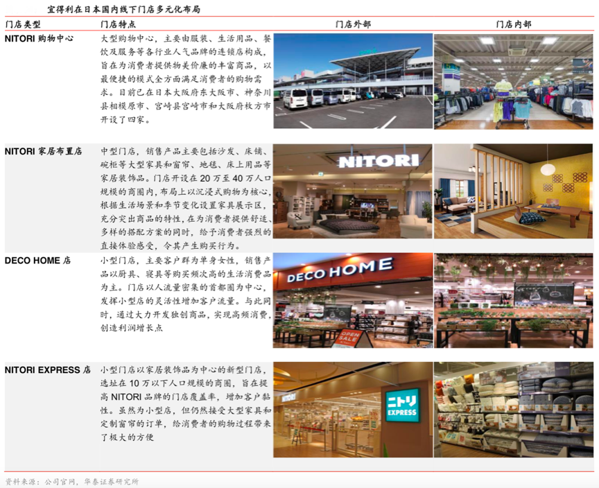 根據(jù)公司官網(wǎng)、華泰證券研究所等綜合資訊表明,宜得利在日本國(guó)內(nèi)進(jìn)行了線下門(mén)店的多元化布局,“品類(lèi)主題店”經(jīng)營(yíng)特色明顯。NITORI購(gòu)物中心門(mén)店主滿(mǎn)足一站式購(gòu)物的需求,進(jìn)行多業(yè)態(tài)經(jīng)營(yíng),融入購(gòu)物中心的商業(yè)經(jīng)營(yíng);家居布置店則強(qiáng)調(diào)20萬(wàn)-40萬(wàn)的城市人口基數(shù),強(qiáng)調(diào)“沉浸式購(gòu)物”;而DECO HOME店主要針對(duì)“單身女性”服務(wù),在廚具、寢具等購(gòu)買(mǎi)頻次高的生活消費(fèi)品為主打,NITORI EXPRESS店則以家居裝飾品為中心,強(qiáng)化家飾高頻消費(fèi)品為主要銷(xiāo)售商品,同時(shí)也接受大型家具和定制窗簾的訂單。