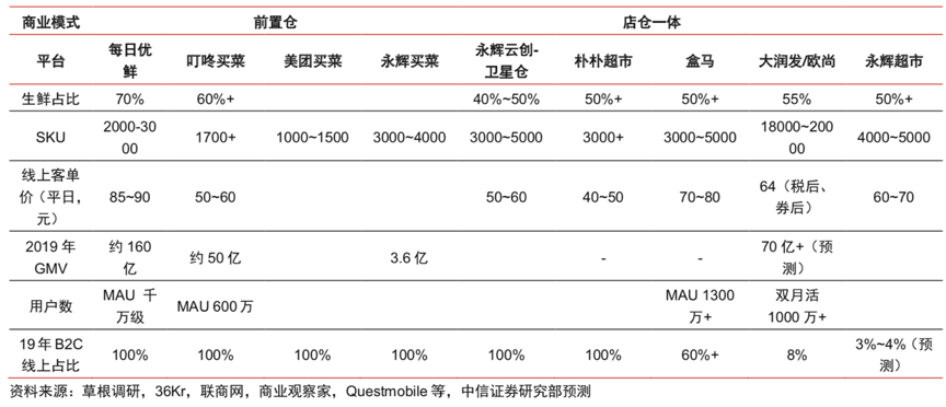 根據(jù)草根調(diào)研、36kr、聯(lián)商網(wǎng)、商業(yè)觀察網(wǎng)、Questmobile、中信證券研究部預(yù)測等綜合資訊表明,國內(nèi)生鮮到家模式大多創(chuàng)始不久,區(qū)域布局多在一二線城市,生鮮占比多在50%以上,線上客單價(jià)多在60元以下,線上成為其主要戰(zhàn)場,這些鮮明的特征告訴我們,“生鮮品類結(jié)構(gòu)”構(gòu)建是生鮮到家模式中關(guān)鍵的一環(huán),強(qiáng)有力的生鮮商品是優(yōu)質(zhì)流量入口,更是生鮮到家模式毛利“調(diào)節(jié)器”。